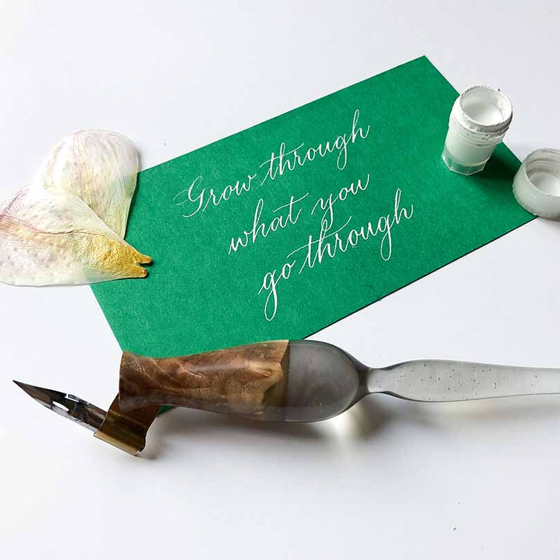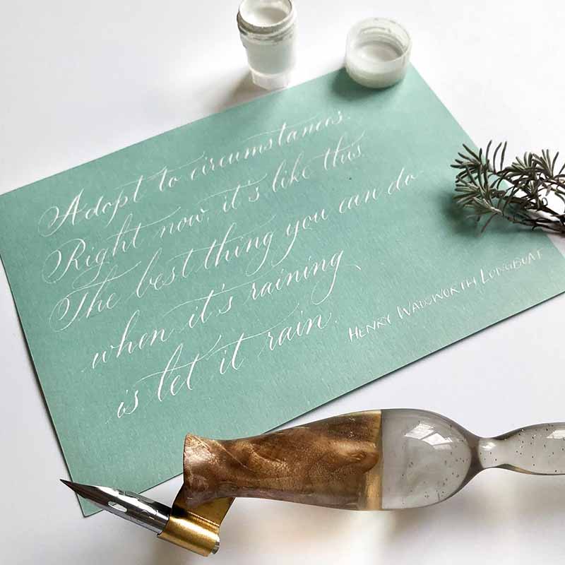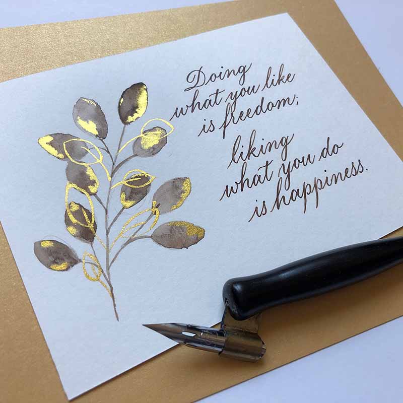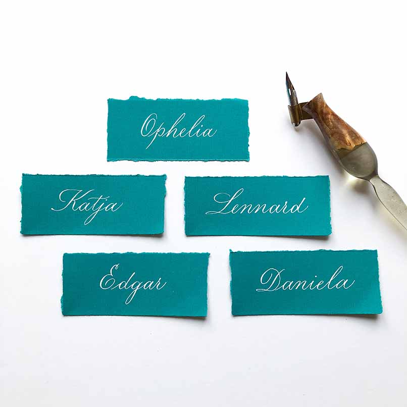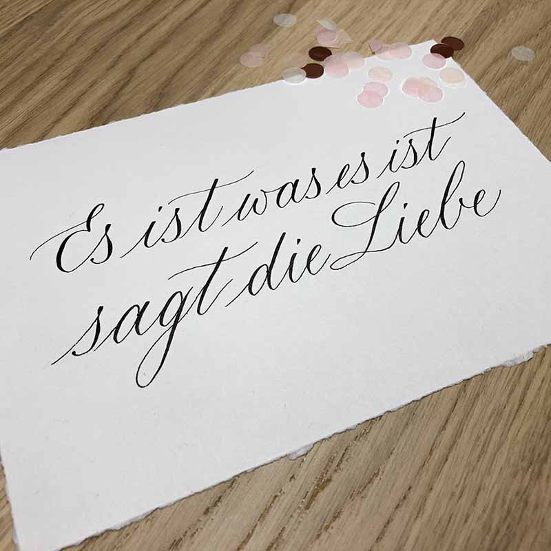 Copperplate ist eine klassische Kalligrafie-Schrift, die fest vorgegebenen Formen folgt. In Copperplate geschriebene Texte sehen in der Regel sehr regelmäßig und ruhig aus, da die Buchstaben alle auf denselben Grundformen basieren. Die Schrift bietet dadurch vielfältige Einsatzmöglichkeiten: Sowohl für kürzere „Highlights“ wie Platzkarten, Überschriften oder kurze Zitate als auch für längere Texte eignet sie sich prima.