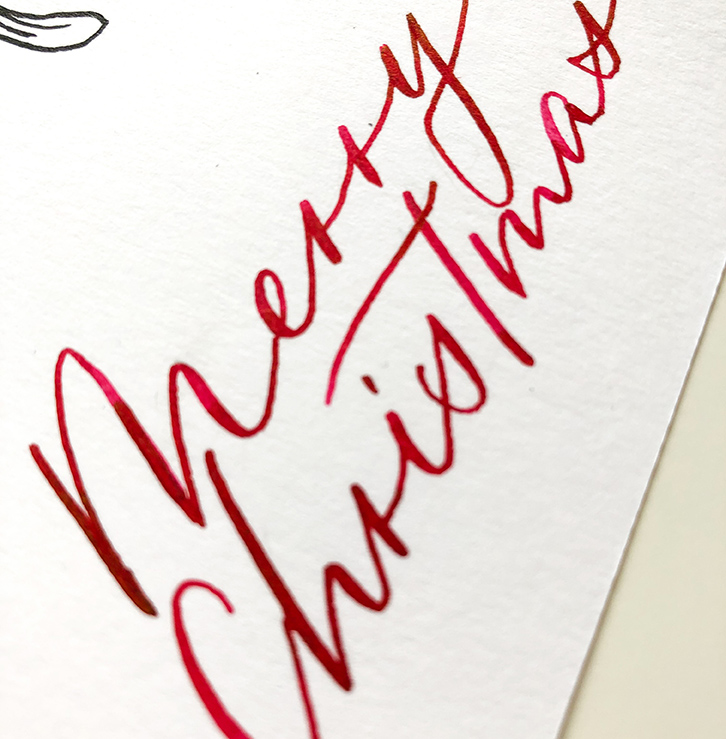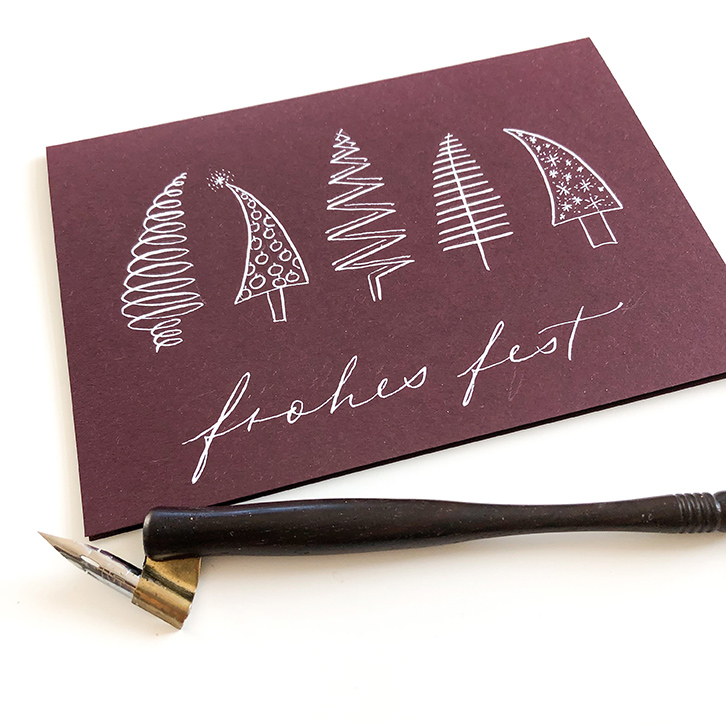 Wenn du dich nun sicher genug fühlst, die Wörter allein zu schreiben, zeichne dir ein kleines Linienraster auf dein Projektpapier, den Geschenkanhänger oder die Weihnachtskarte. Nun kannst du die geübten Wörter entweder mit Bleistift vorschreiben oder direkt zu Feder und Tinte greifen. (Mit ganz normalen Stiften, Brushpens oder einem Füller funktioniert es natürlich auch hier. Sie sollten nur nicht zu dick sein.)