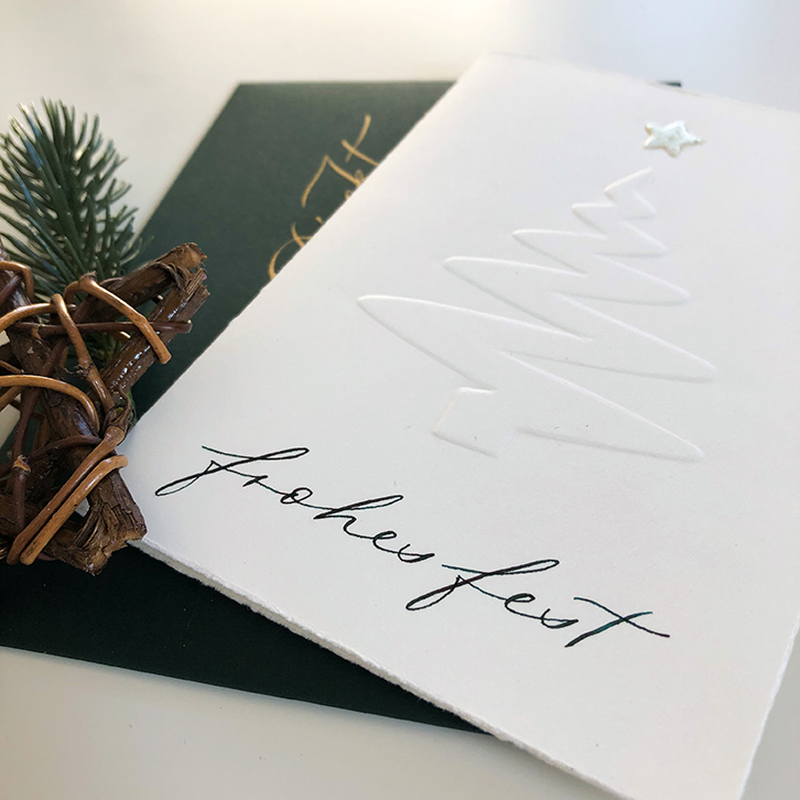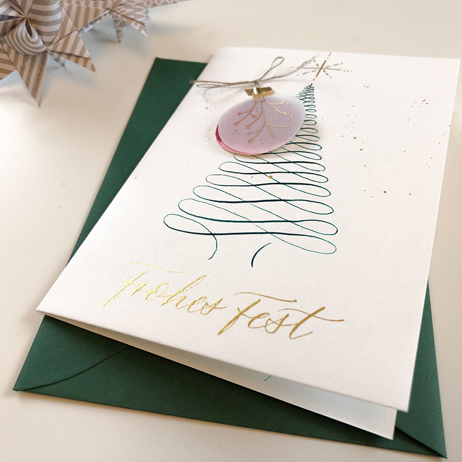 Du kannst die Kalligrafievorlagen für die Weihnachtswörter natürlich einfach nur zum Üben nutzen (z. B. mit Procreate, s. o.) oder aber du wendest die neu erlernten Wörter gleich auf deinen Weihnachtskarten und Geschenkanhängern an. Dann geh einfach nach dieser Anleitung vor (auch im PDF enthalten):